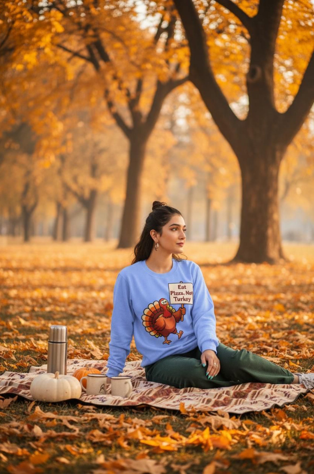 Whether you’re a pizza lover, vegetarian, or just love funny Thanksgiving designs, this sweatshirt is sure to be a conversation starter. Pair it with jeans or joggers for a laid-back, festive look that’s both comfy and full of personality.
